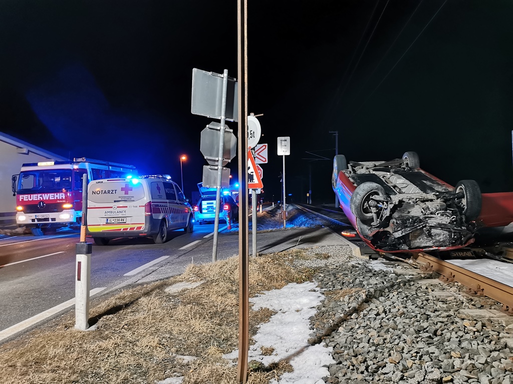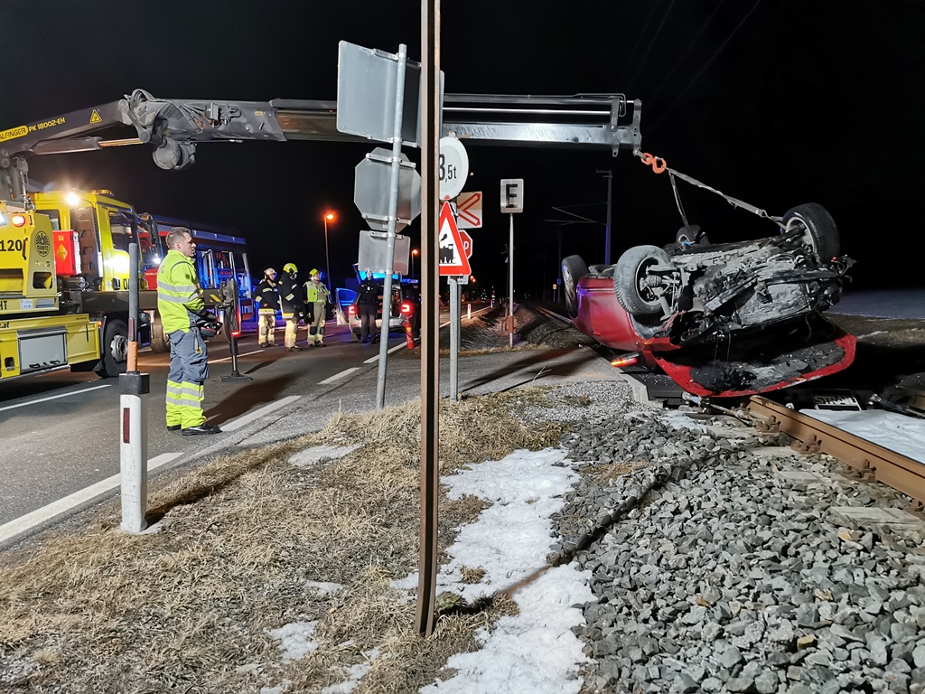 Aus zunächst ungeklärter Ursache kam am 15. Februar 2022 gegen 00.15 Uhr ein Auto von der L69 ab, überschlug sich und blieb schließlich auf dem Bahnübergang zum Säulingweg liegen.